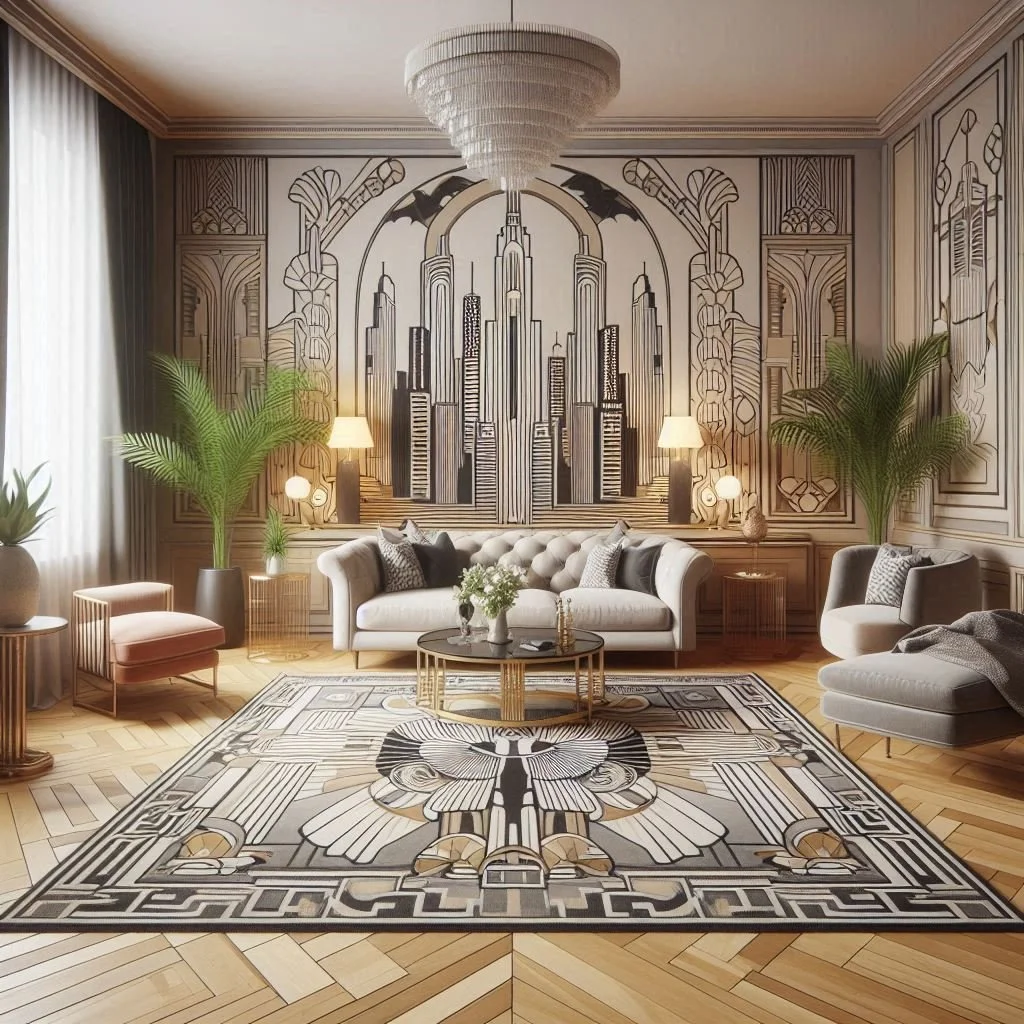 Anchor your space with stylized Art Deco rugs featuring geometric patterns, bold colors, and luxurious textures. Rugs are an essential element of any room design, providing warmth, comfort, and visual interest to your apartment decor. Look for rugs with bold graphic prints, sleek lines, and vibrant hues to capture the spirit of the Art Deco era. Whether it's a wool rug, silk rug, or synthetic rug, incorporating an Art Deco-inspired rug into your living room, bedroom, or dining area adds a touch of glamour and sophistication to your home decor.