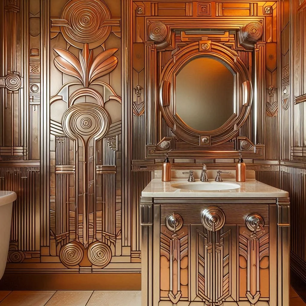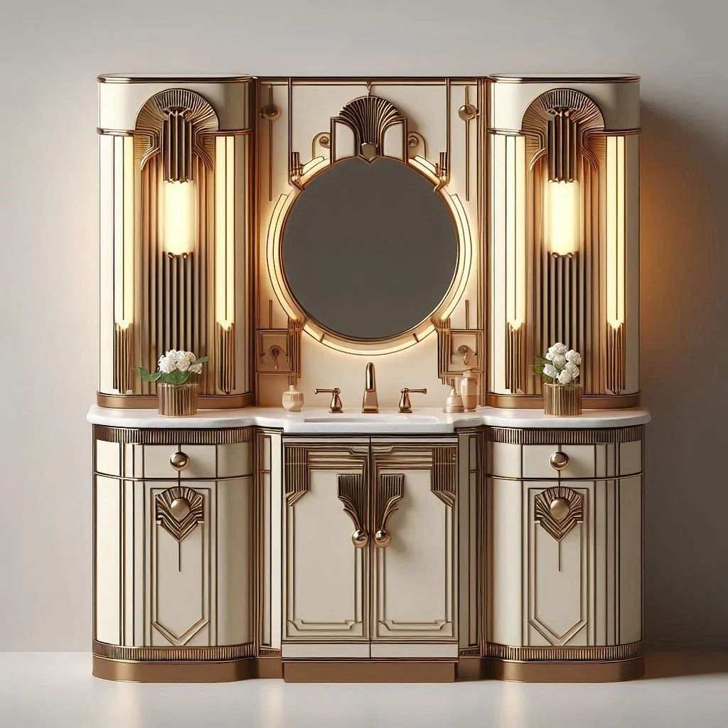 To add a luxurious element to your bathroom, consider cabinets with metallic inlays in shades of gold, silver, or bronze. These inlays can form intricate geometric patterns or simple, elegant lines that frame each cabinet door, bringing a touch of Art Deco sophistication to the space. The metallic accents catch and reflect light, creating a subtle glow that enhances the overall ambiance and adds an opulent feel to the room. This design detail infuses the cabinets with refinement, making them stand out as focal points while maintaining a polished and cohesive look. Metallic inlays are ideal for those seeking a refined touch, as they combine the richness of Art Deco design with modern sensibility. By incorporating these gleaming accents, you elevate the aesthetic of your bathroom, adding depth, elegance, and a vintage-inspired glamor that feels both timeless and contemporary.