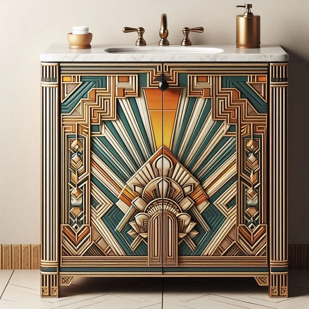Art Deco style is celebrated for its bold geometric shapes and striking patterns, making it perfect for adding visual interest to your bathroom. Incorporating cabinets with geometric designs, such as diamonds, chevrons, or other angular patterns, infuses your space with the era's signature flair. These designs can be subtle, with delicate inlays or etched details on cabinet doors, or more pronounced with high-contrast colors that make a statement. Geometric cabinetry brings a layer of sophistication and style, adding depth and texture without overwhelming the room. The unique shapes create a focal point, enhancing the overall decor with a refined, artistic touch. Perfect for those who appreciate the elegance of Art Deco, geometric cabinets transform a standard bathroom into a chic, eye-catching space inspired by the glamour of the 1920s and 1930s.