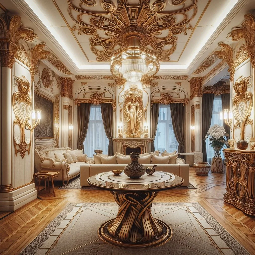 Ornate Details: Pay meticulous attention to decorative details such as intricate carvings, embossed patterns, and gilded accents in your Art Nouveau interior design. These elements evoke the craftsmanship and opulence of the Art Nouveau era, adding a sense of luxury and refinement to your space. Look for furniture pieces with delicately carved motifs inspired by nature, such as swirling vines or floral embellishments. Embossed patterns on walls, ceilings, and architectural elements further enhance the aesthetic, creating depth and texture throughout the room. Incorporate gilded accents on furniture hardware, light fixtures, and decorative accessories to infuse your space with an air of elegance and sophistication reminiscent of the Art Nouveau movement's heyday.