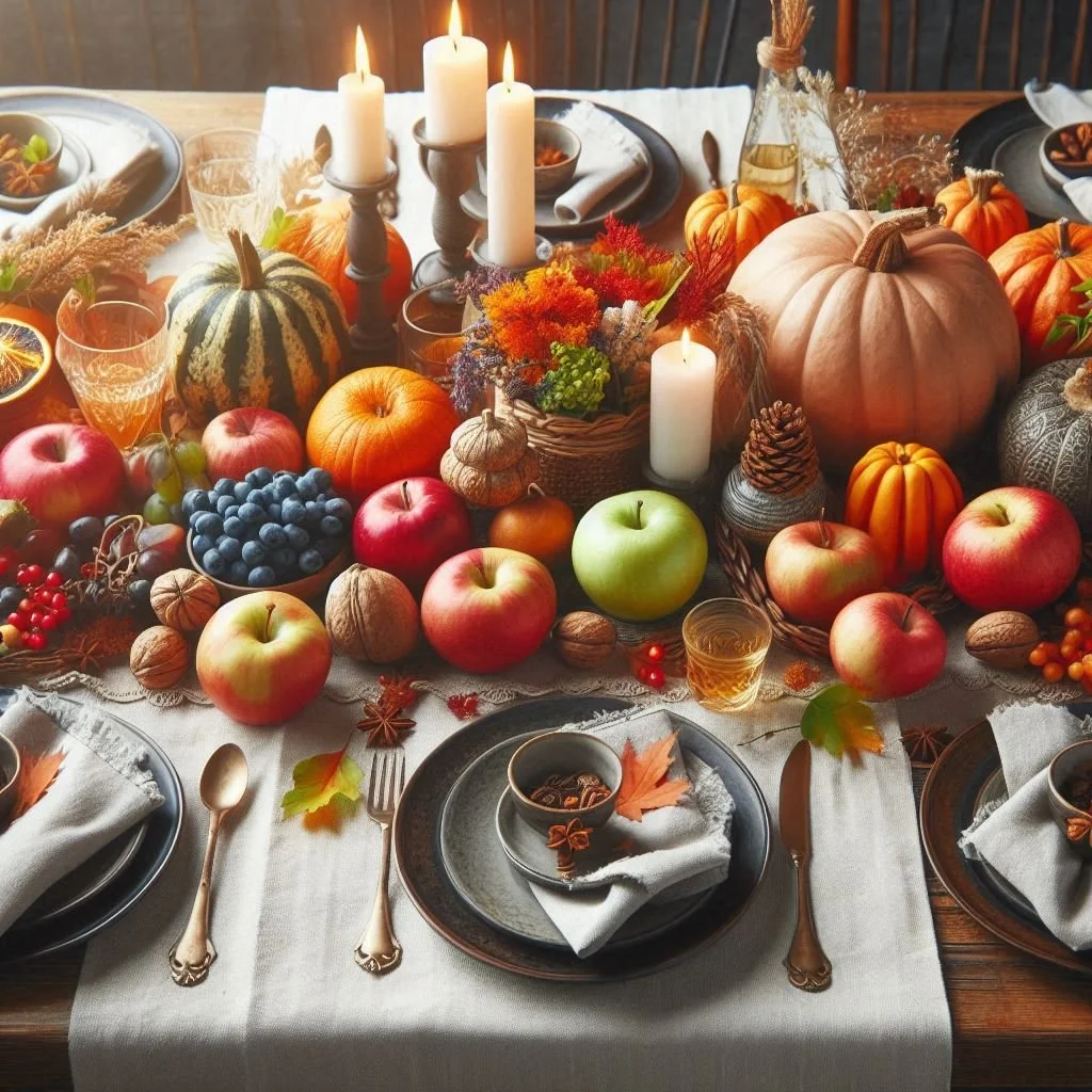 Autumn is filled with rich, beautiful produce, making it the perfect addition to your table decor. Incorporate seasonal favorites like apples, pears, and corn to create a bountiful, harvest-inspired display. Arrange them in a large bowl for an eye-catching centerpiece, or scatter them along the table for a rustic, natural look. These fruits and vegetables not only bring vibrant color and texture to your setup but also add a fresh, earthy charm that celebrates the essence of the season. This decorative choice is both practical and visually appealing, offering a touch of nature to your table while enhancing the cozy, inviting atmosphere of your autumn gatherings. Plus, it’s an easy way to embrace the season’s bounty while keeping your decor simple yet festive.