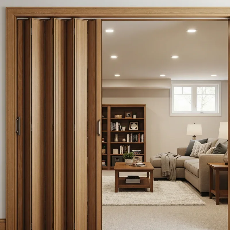 Think beyond the dated vinyl accordion doors of yesteryear! Modern accordion folding doors offer sophisticated solutions for basement entrances that need maximum flexibility. These contemporary versions use high-quality materials like engineered wood, aluminum frames with fabric panels, or even glass sections that create striking visual effects when folded. The ability to partially open these doors provides ventilation options that fixed doors can't match, perfect for basements that double as workshops or exercise rooms. When fully opened, they practically disappear, creating an almost seamless transition between floors. Advanced track systems ensure smooth, quiet operation without the squeaking and sticking associated with older models. The vertical lines created by the fold pattern add architectural interest, while custom finishes allow perfect coordination with your existing decor palette.