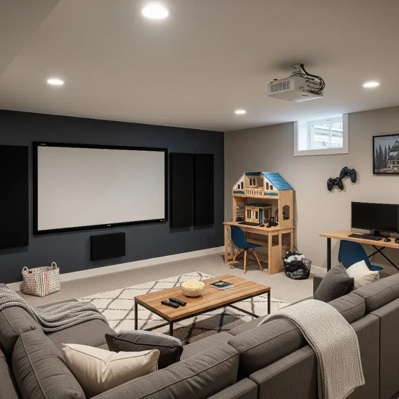 Create an entertainment zone where family movie nights and gaming sessions become legendary experiences kids anticipate all week! Mount a large screen TV or install a projector for that authentic theater feeling during movie marathons. Add comfortable seating like bean bags, floor cushions, or a sectional sofa that accommodates the whole family. Set up gaming consoles with organized controller storage to prevent tangles and missing pieces. Include a popcorn machine or snack station for authentic movie theater vibes without the expensive tickets. Sound-absorbing panels or thick curtains improve acoustics while preventing noise from disturbing upstairs activities. Create different zones for video games versus movie watching if space allows. This multi-purpose entertainment area becomes the go-to spot for rainy day fun, birthday parties, and weekend family bonding.