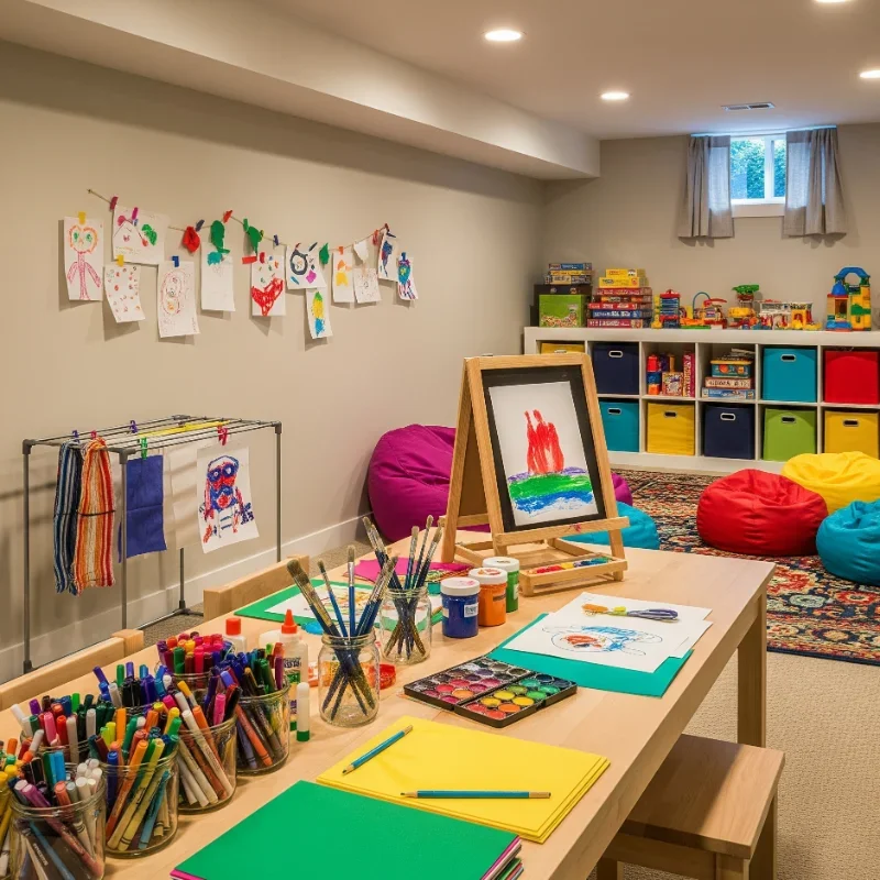 Design a creative hub where messy masterpieces can happen without stressing about your dining room table! Install a large table at kid-appropriate height with wipeable surfaces that handle paint, glue, and marker accidents gracefully. Open shelving or clear containers store supplies visibly, encouraging independent creative exploration when inspiration strikes. Hang a clothesline or wire system for displaying wet artwork, turning the space into an ever-changing gallery. Include a sink nearby if possible, making cleanup easier and teaching responsibility after creative sessions. Stock various materials from basic crayons to special supplies like googly eyes, pipe cleaners, and glitter for diverse projects. Protect walls with washable paint or install a large bulletin board for displaying finished pieces. This dedicated space means art supplies stay organized and accessible rather than scattered throughout your home.
