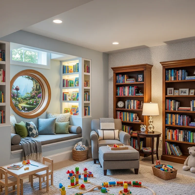 Create a cozy literary escape where young bookworms can lose themselves in magical stories and grand adventures! Install floating shelves at kid-height displaying books with covers facing out, making selection irresistible and easy. Add bean bags, floor cushions, or a small tent filled with pillows for the ultimate comfort while reading. String fairy lights overhead to create a magical ambiance that makes reading feel special, not like homework. Include a variety of lighting options from reading lamps to natural light if basement windows exist. Organize books by reading level or interest, with picture books low and chapter books higher up. A small basket system helps kids return books to proper spots, teaching organization skills naturally. This quiet zone provides a peaceful retreat when kids need downtime from active play or sibling chaos.