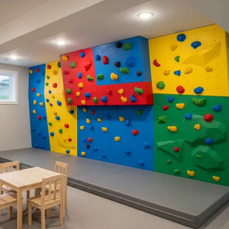 Transform one basement wall into an exciting climbing adventure that builds strength, confidence, and problem-solving skills! Install colorful climbing holds at various difficulty levels, creating routes that challenge different ages and abilities. Thick crash mats below ensure safe landings while kids test their limits and conquer new heights. The vertical play saves floor space while providing endless entertainment that beats screen time any day. Add fun themes like reaching for painted clouds, scaling a castle wall, or climbing toward space-themed decorations. You can start with a small section and expand as kids grow and skills improve. Include a timer and route cards for friendly competitions between siblings or friends. This active play option helps burn energy during bad weather when outdoor play isn't possible. The climbing wall becomes a source of pride as kids master increasingly difficult routes.