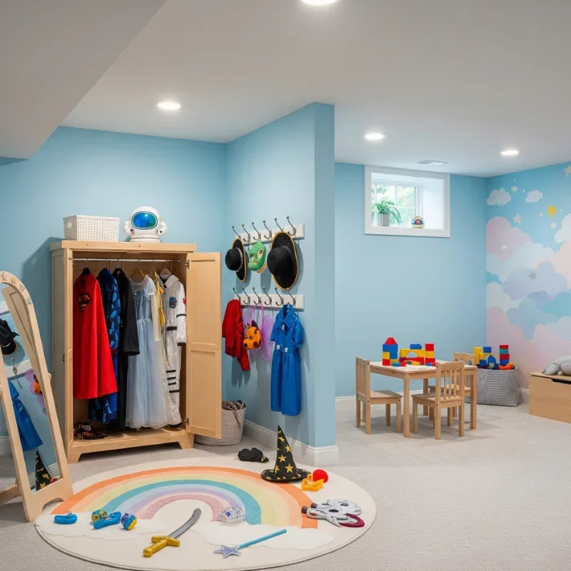 Build a magical wardrobe where everyday kids transform into pirates, princesses, superheroes, and anything imagination conjures! Install low hooks and rods where costumes hang within easy reach, encouraging independent dress-up play. Add a full-length mirror (safely mounted) where kids can admire their creative costume combinations. Include accessory bins for hats, wands, swords, and jewelry that complete any character transformation. A small stage area or designated "runway" makes costume fashion shows extra special. Store-bought costumes mix with thrift store finds and homemade creations for endless character possibilities. Add a trunk or ottoman for storing smaller items like masks, gloves, and costume jewelry. This imaginative play area helps develop storytelling skills, confidence, and creative expression while providing entertainment that never gets old.