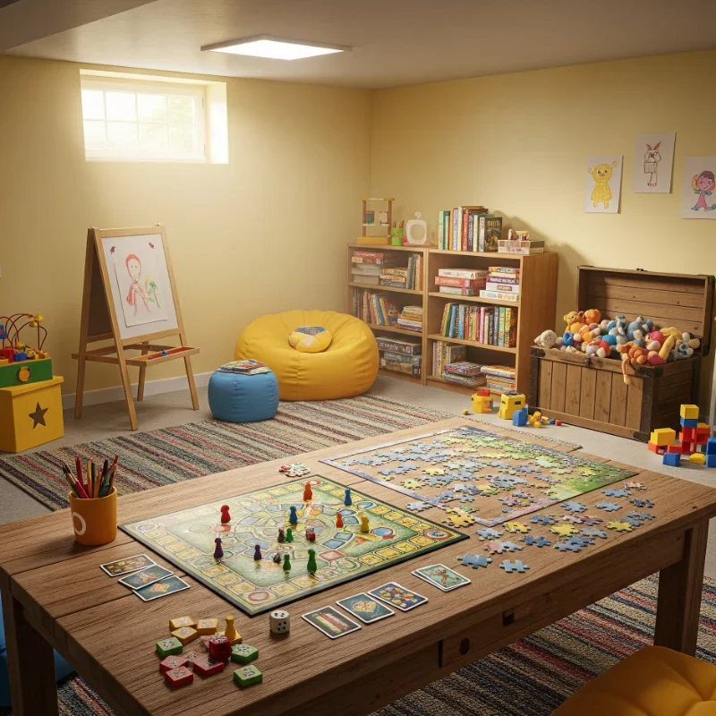 Create a strategic gaming headquarters where family game nights and puzzle challenges bring everyone together! Build or buy storage specifically designed for board games, keeping boxes organized and pieces contained. Set up a large table with comfortable seating where marathon Monopoly sessions or puzzle building can continue undisturbed. Install shelving displaying completed puzzles as artwork before breaking them down for repeat enjoyment. Include good overhead lighting preventing eye strain during detailed puzzle work or reading game cards. Organize games by age appropriateness and type, making selection easy for different occasions. This social play area encourages critical thinking, patience, and family bonding through friendly competition and collaborative puzzle solving.