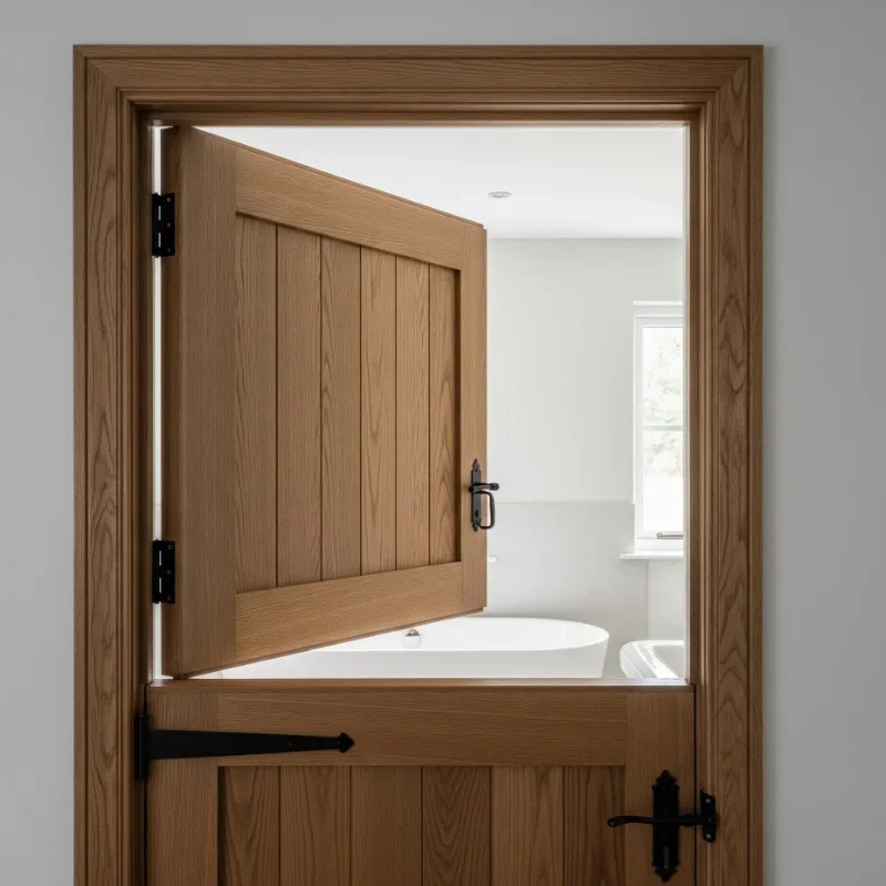 Add charming functionality with Dutch doors that split horizontally, allowing independent operation of top and bottom halves. These clever doors offer the best of both worlds: ventilation and interaction up top, privacy down below! Perfect for homes with pets or small children, keeping them out while maintaining airflow and communication. The top half can stay open for light and air while the bottom remains closed for privacy. Traditional designs feature cottage-style appeal while modern versions offer clean-lined sophistication. Hardware options include coordinated locks for both halves or independent operation based on needs. Shelf attachments on the bottom half create temporary surfaces for bathroom supplies. The unique design becomes an instant conversation piece that adds personality to your home. Your bathroom door becomes a versatile barrier that adapts to various situations throughout the day.
