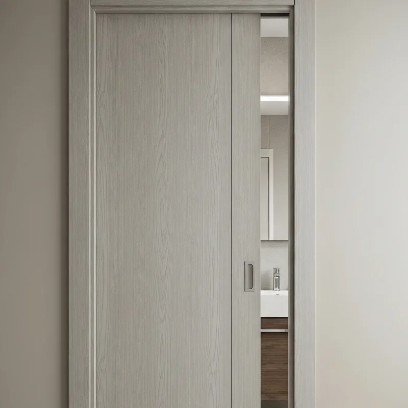 Make your door disappear like a magician's trick with pocket doors that slide directly into the wall cavity when opened. These space-saving champions are perfect for small bathrooms where every square inch counts! No more awkward door swings that block hallways or bump into fixtures. The completely hidden design when open creates seamless flow between spaces, making your home feel larger and more connected. Modern pocket door systems include soft-close features and improved tracking that eliminates the frustrating stuck-door syndrome of older models. Choose solid core options for better sound insulation, keeping bathroom activities private. Installation requires wall cavity preparation, but the payoff in saved space is incredible. Add a recessed handle for a ultra-clean look that maintains the minimalist aesthetic. Your bathroom becomes more accessible while looking sleeker than ever before.