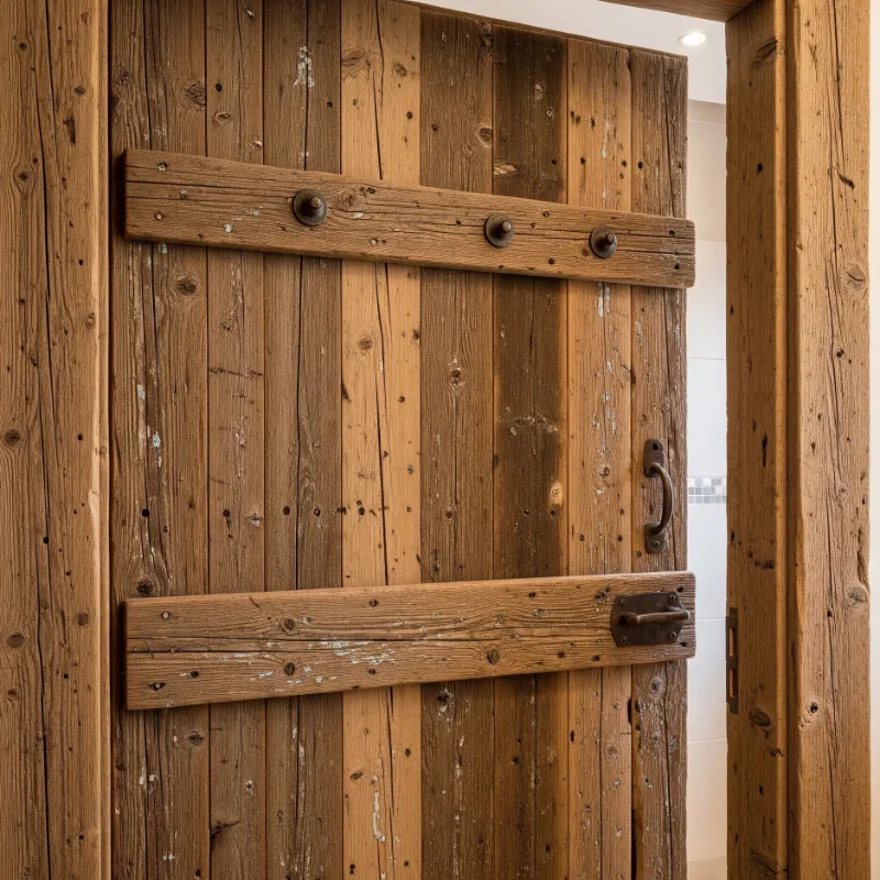 Channel cabin coziness with rustic plank doors that bring natural warmth and organic texture to your bathroom entrance. These doors look like they were crafted from reclaimed barn wood, adding instant character to any space! Vertical planks create height illusion while horizontal arrangements add width perception to narrow spaces. Choose from genuine reclaimed wood for authenticity or new wood distressed for the rustic look without the hefty price tag. Metal strap hinges and industrial hardware enhance the farmhouse appeal. The solid construction provides excellent sound insulation for privacy. Seal the wood properly to protect against bathroom humidity while maintaining the natural grain beauty. Mix wood tones for added visual interest or stick to a single shade for cohesive design. Your bathroom door becomes a piece of functional art that connects your home to nature.