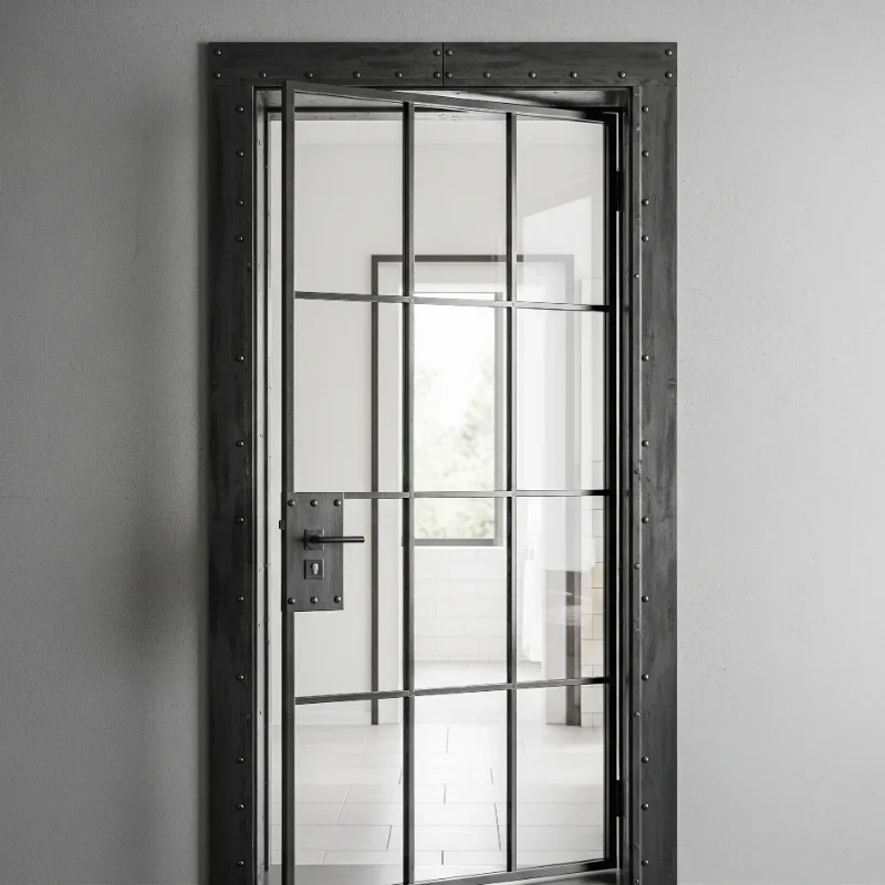 Make a bold statement with industrial-style metal frame doors that bring urban loft vibes to your bathroom entrance. These striking doors combine slim metal frames with glass panels for an edgy yet sophisticated look! Black steel frames create dramatic contrast against light walls, while brass or copper options add warmth and luxury. The grid pattern of metal mullions adds geometric interest without overwhelming the space. Choose from clear, frosted, or textured glass inserts based on privacy preferences. The metal construction stands up to humidity better than wood, making it practical for bathroom use. Powder coating prevents rust and allows for custom color options. The industrial aesthetic pairs beautifully with exposed brick, concrete floors, and modern fixtures. Your bathroom entrance becomes an architectural element that bridges different design styles seamlessly.