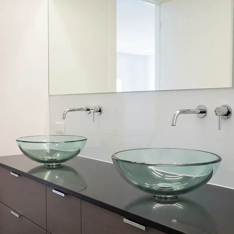A: Daily squeegee use and weekly cleaning with vinegar solution keeps glass sinks spotless and clear.
