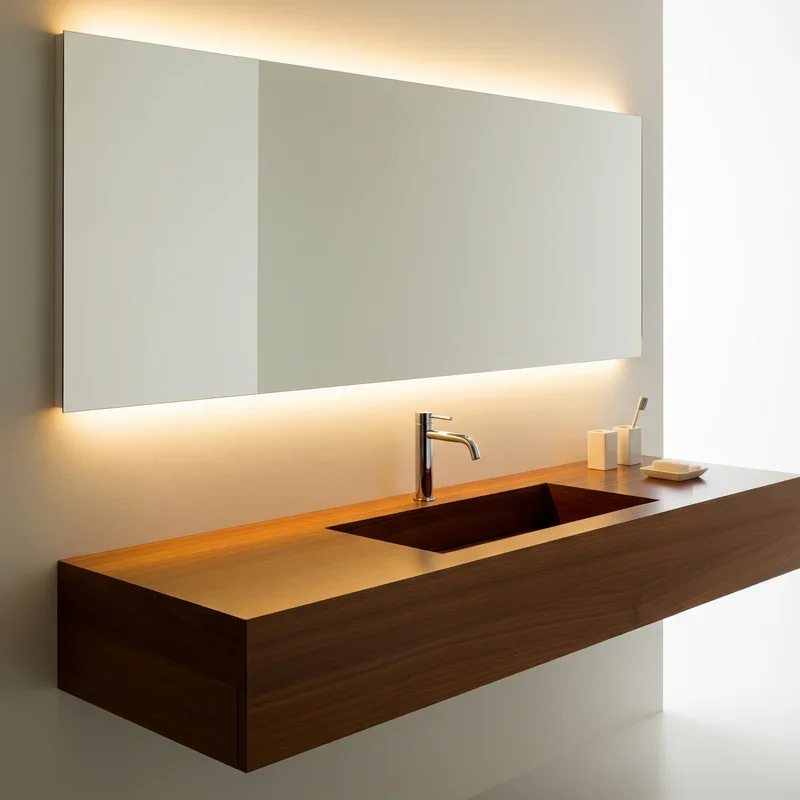 Embrace the future of bathroom design with a floating vanity featuring an integrated sink that looks like it was carved from a single piece of material. Modern magic suspended in air! These all-in-one wonders mount directly to the wall, creating floor space that makes your bathroom appear larger and easier to clean. The seamless integration eliminates joints where mold and mildew typically party. Materials like solid surface, concrete, or engineered stone offer durability with endless customization options. The floating design accommodates any height preference, making it perfect for tall folks tired of hunching over standard vanities. Hidden drainage and plumbing maintain the clean aesthetic while providing full functionality. Add under-vanity lighting for a stunning nighttime glow that makes the whole unit appear to levitate. Your integrated floating sink becomes the futuristic centerpiece that makes your bathroom feel like it belongs in an architectural magazine.