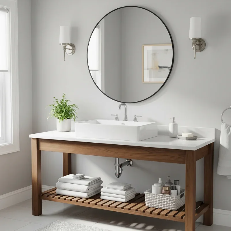Combine vintage appeal with practical storage using a console sink that showcases beautiful brackets while providing shelving space. Style meets storage brilliantly! These sinks feature decorative metal or wood legs that support the basin while leaving space below for baskets, towels, or decorative elements. The open design maintains visual spaciousness while offering more storage than pedestal sinks. Choose from authentic vintage pieces or modern reproductions that capture classic style with updated functionality. The exposed plumbing becomes part of the aesthetic when finished in matching metals. Multiple shelf levels provide organization without the bulk of traditional vanities. The design works beautifully in both period homes and modern spaces seeking vintage character. Your console sink becomes the perfect compromise between style and storage that makes small bathrooms both beautiful and functional.