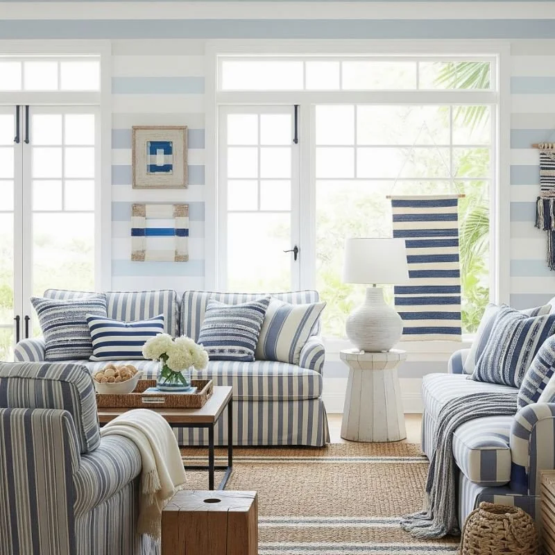 Introduce classic nautical style with striped patterns in pillows, rugs, and upholstery that never go out of coastal fashion. Navy and white stripes evoke sailing heritage, while softer blue and cream combinations feel more beach cottage. Mix stripe widths and directions to create visual interest without overwhelming the space. It's like dressing your room in a classic Breton shirt! Use striped roman shades or curtains to add pattern at windows. A striped area rug can define seating areas while adding coastal personality. Balance stripes with solid colors to prevent pattern overload. Consider unexpected stripe colors like coral or aqua for a modern coastal twist. These timeless patterns work in any beach-inspired room, from traditional nautical to contemporary coastal. The linear nature of stripes can make rooms appear larger when used strategically.