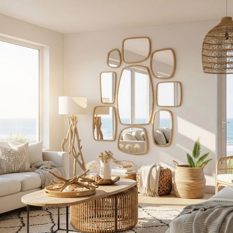 Create the illusion of ocean views with strategically placed mirrors that reflect light and expand your beach-themed living room. Choose mirrors with frames made from weathered wood, rope, or painted in coastal whites and blues. Arrange multiple mirrors gallery-style or use one large statement mirror to maximize impact. It's like adding windows to the sea! Porthole-style mirrors add authentic nautical charm, while sunburst mirrors evoke the beach's sunny disposition. Position mirrors to reflect natural light or pleasant views, making rooms feel larger and brighter. Consider mirrored furniture pieces like side tables or consoles to enhance the light-reflecting effect. The strategic use of mirrors is especially valuable in smaller spaces or rooms without actual ocean views. These reflective surfaces become functional art that enhances your coastal theme.