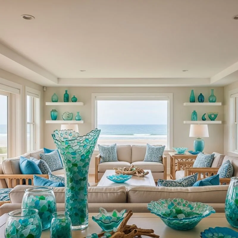 Capture the magic of beach-combed treasures with sea glass inspired accessories that add subtle color and coastal charm. Display collected sea glass in clear vases, incorporate sea glass-toned pillows, or choose artwork featuring these frosted gems. The soft blues, greens, and white of sea glass perfectly embody coastal color palettes. It's like sprinkling mermaid tears throughout your room! Use sea glass-filled hurricane lamps for ambient lighting that casts colored shadows. Consider sea glass drawer pulls or cabinet knobs for subtle coastal touches. These accessories work beautifully against white or neutral backgrounds, adding just enough color without overwhelming. Create DIY projects using sea glass for personalized decor. The frosted appearance and organic shapes of sea glass pieces bring authentic beach elements indoors while maintaining sophisticated style.