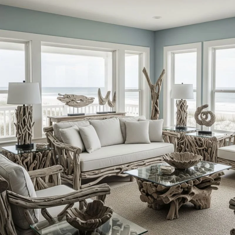 Bring the beach's natural sculptures indoors with driftwood furniture and decorative accents that add organic beauty to your living space. A driftwood coffee table becomes an instant conversation piece, its weathered surface telling tales of ocean journeys. Consider driftwood mirror frames, table lamps, or sculptural pieces that capture nature's artistry. It's like the ocean delivered furniture directly to your door! The grey-brown tones of driftwood complement any coastal color scheme while adding texture and visual interest. You can find authentic pieces at beach shops or create DIY projects using collected driftwood. Balance these natural elements with softer furnishings to maintain comfort. Driftwood shelving provides both function and coastal charm, perfect for displaying beach treasures. The irregular shapes and smooth surfaces weathered by waves create unique focal points that no manufactured furniture can replicate.