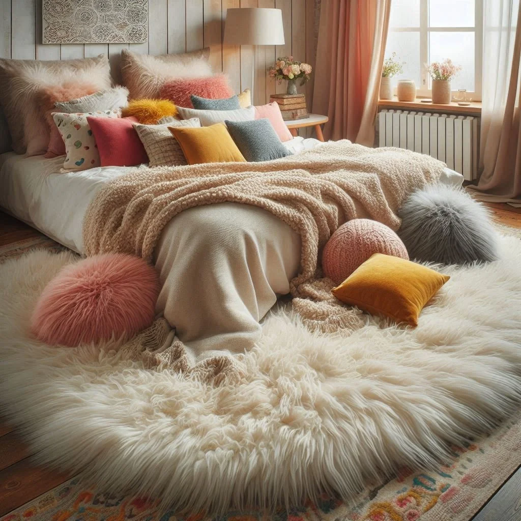Incorporating a rug or throw instantly adds warmth and comfort to your bedroom, making it feel more inviting. A plush area rug placed partially under your bed not only grounds the space but also provides a soft surface to step on in the morning. For added texture, drape a chunky knit blanket over a chair or the foot of the bed. These cozy accents enhance the room's aesthetic while offering practical comfort during cooler months. Opt for materials like wool, faux fur, or woven cotton to create layers of texture that make the space feel lived-in and welcoming. You can also play with colors and patterns to complement your existing decor, whether you prefer subtle tones or bold contrasts. Rugs and throws not only elevate the room’s visual appeal but also introduce a sense of relaxation, making your bedroom a personal retreat.