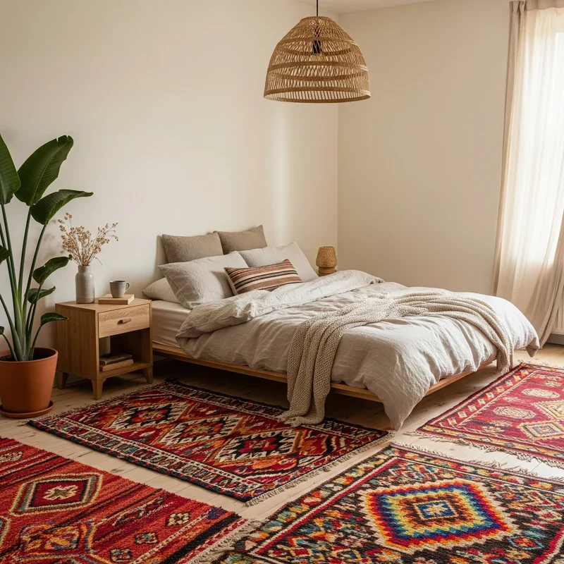 Transport your bedroom to a Marrakech marketplace with vibrant Moroccan rugs that celebrate color, pattern, and free-spirited design. Boho dreams come true! These rugs feature geometric diamonds, zigzags, and tribal motifs in combinations that shouldn't work but absolutely do. Choose authentic Beni Ourain styles for subtle elegance or go bold with multicolored Boucherouite rugs made from recycled textiles. The thick pile of traditional Moroccan rugs provides incredible comfort underfoot while adding serious style points. Mix with plants, macramé, and warm wood tones for full bohemian immersion. Don't be afraid to clash patterns; Moroccan design celebrates the beauty of organized chaos. The handmade quality means each rug is unique, giving your bedroom one-of-a-kind character. Your Moroccan rug becomes the foundation for a bedroom that feels like a creative sanctuary.