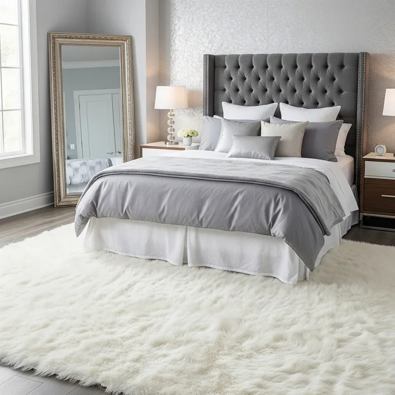 Channel old Hollywood glamour with luxurious faux fur rugs that add drama and sophistication to your bedroom. Glamour without the guilt! Modern faux fur offers incredible softness and visual appeal without ethical concerns, available in everything from classic white to bold jewel tones. Place beside your bed for a luxurious landing spot or drape across a bench for added texture. The plush surface provides warmth and comfort while creating a focal point that screams luxury. Choose machine-washable options for practical glamour that doesn't require professional cleaning. Layer over hardwood or tile floors for maximum impact and comfort. Small faux fur rugs work as accents, while larger pieces can define seating areas. Your faux fur rug becomes the touch of elegance that elevates your bedroom from ordinary to extraordinary.