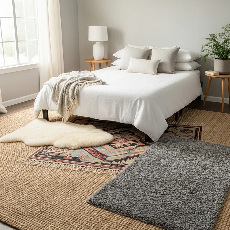 Create a curated floor gallery by combining multiple smaller rugs in complementary styles, just like an art collection. Floor art at its finest! Arrange various sized rugs throughout your bedroom, each defining different functional zones. Mix patterns and textures that share a common color palette for cohesion without matching. This approach works brilliantly in large bedrooms that need definition or studio apartments requiring zone separation. Use different rugs to distinguish sleeping, dressing, and lounging areas within the same space. The eclectic mix adds personality and allows you to incorporate multiple styles you love. Vintage finds mixed with new pieces create a collected-over-time feel that adds character. Your rug collection becomes a reflection of your evolving style and travels, telling your story through textiles.