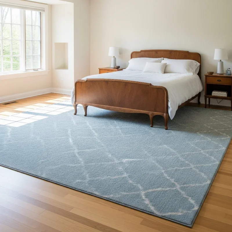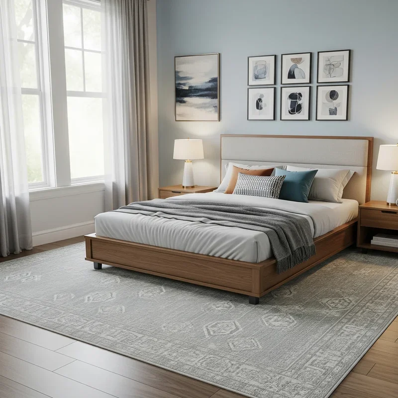 A: Choose 8x10 for queen beds, 9x12 for kings, extending 18-24 inches beyond bed sides.