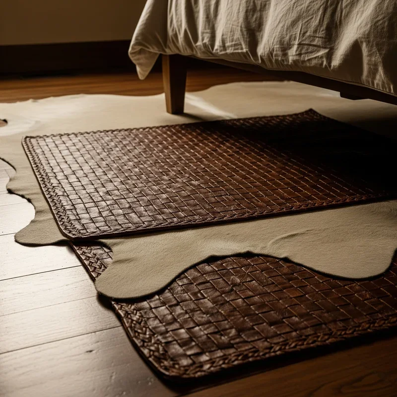 Add rugged sophistication with hide or leather rugs that bring natural textures and organic shapes to your bedroom. Ranch meets refinement! Cowhide rugs offer unique patterns that make each piece one-of-a-kind artwork for your floor. The natural variations in color and markings add visual interest without overwhelming pattern. These durable rugs age beautifully, developing character over time like your favorite leather jacket. Position them at angles to add dynamic energy to traditional bedroom layouts. Faux hide options provide the look without the price tag or ethical concerns. The smooth surface is surprisingly easy to clean and doesn't trap allergens like traditional rugs. Mix with modern furniture for an eclectic look or pair with rustic elements for full cabin vibes. Your hide rug becomes the statement piece that adds unexpected edge to bedroom decor.