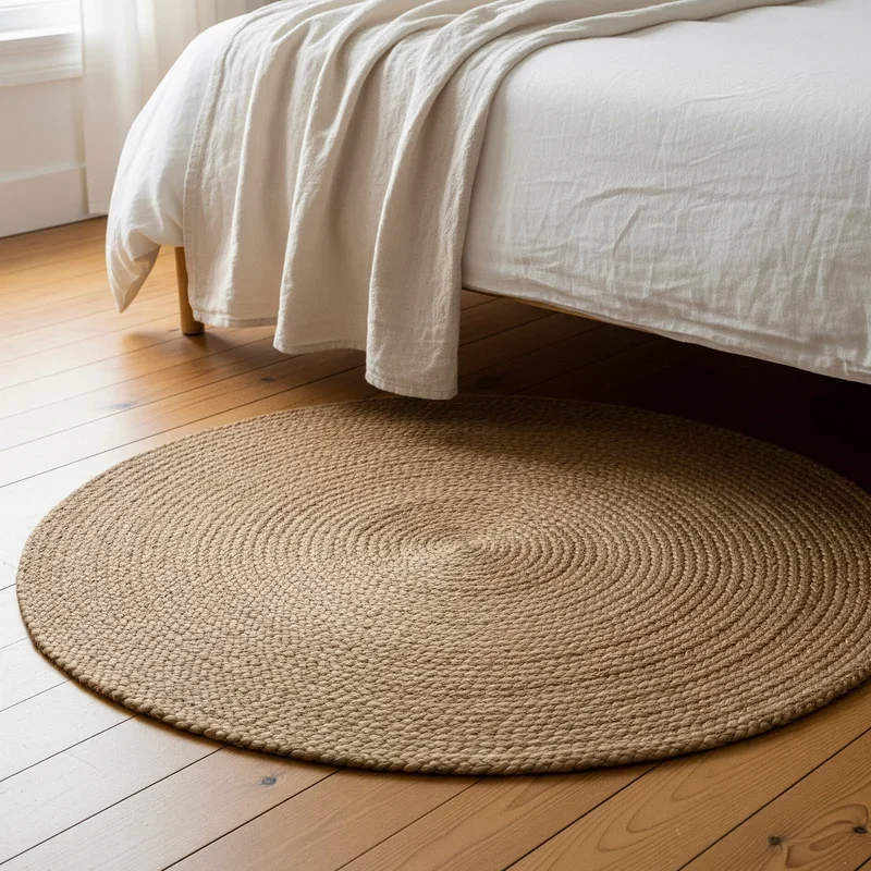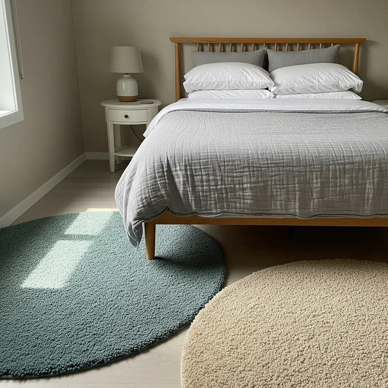 Break free from rectangular predictability with round rugs that add unexpected curves and soften angular bedroom layouts. Circles are the new squares! Position a round rug under a reading chair to create a defined seating area within your bedroom. Use them to highlight architectural features like bay windows or to soften the space at the foot of your bed. The circular shape naturally draws the eye inward, making it perfect for creating intimate zones. Large round rugs can anchor the entire room when centered under the bed, especially effective with round or oval beds. Mix circular rugs with angular furniture for dynamic contrast that keeps the eye moving. Choose patterns that radiate from the center to emphasize the round shape. Your round rug becomes the design element that proves you think outside the box.
