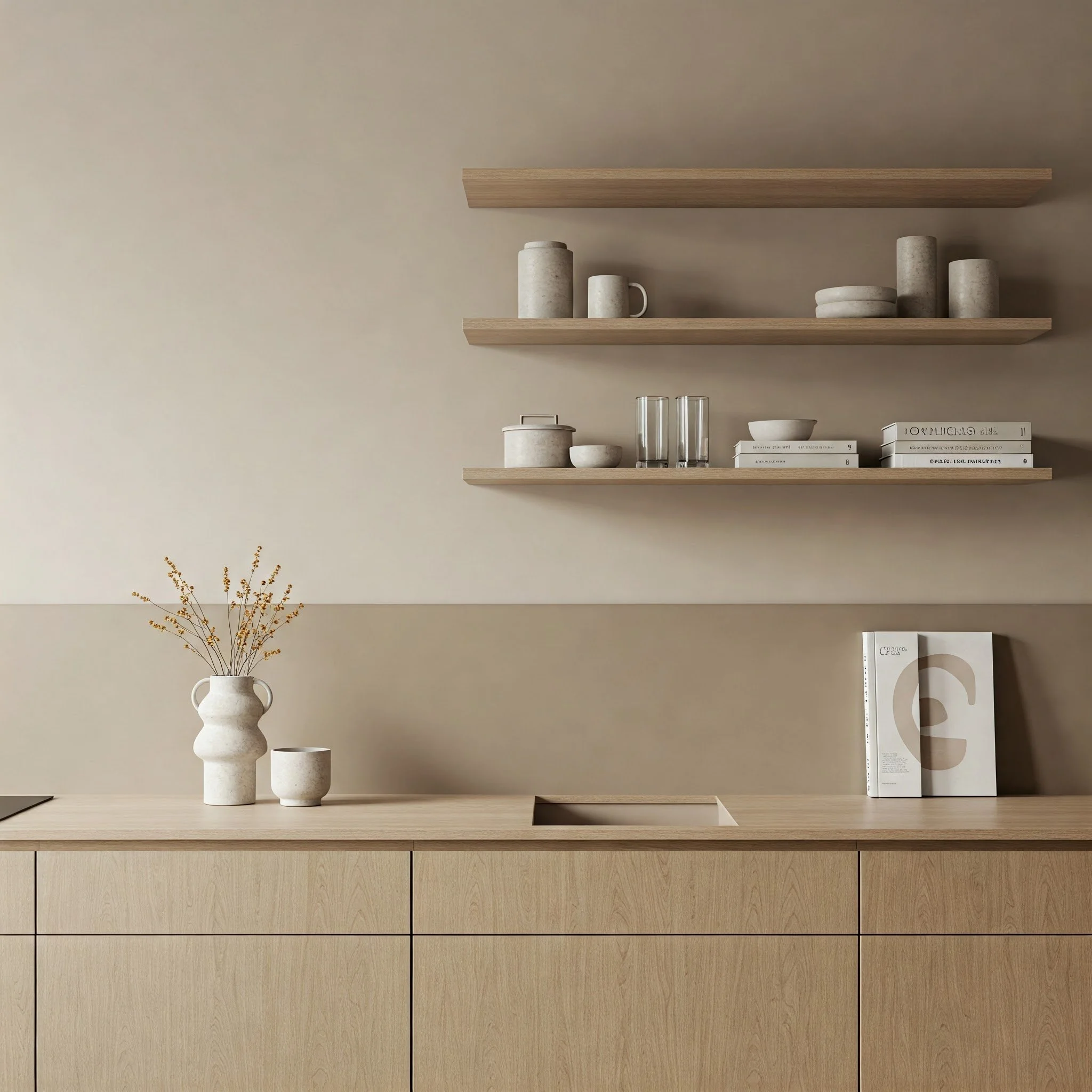 7. Open Shelving and Beige Backdrops