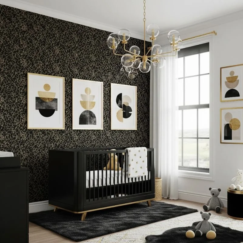 Create sophisticated nurseries that grow with children by incorporating black and gold elements in age-appropriate ways that provide luxury without sacrificing safety or functionality. This approach allows you to design beautiful spaces that reflect adult aesthetic preferences while remaining suitable for children's needs and developmental stages. Add gold picture frames with children's artwork, metallic toy storage boxes, or brass table lamps that provide elegant organization while maintaining child-friendly safety. Black accent walls or dark furniture pieces provide sophisticated backdrops that won't show wear as easily as lighter colors might over time. The combination creates nurseries that photograph beautifully while providing practical functionality for busy parents and growing children. Consider adding gold-trimmed blankets, metallic night lights, or brass bookends that add luxury touches without overwhelming spaces with adult-oriented formal elements. This design approach creates nurseries that feel sophisticated enough for design magazines while remaining completely appropriate for children.