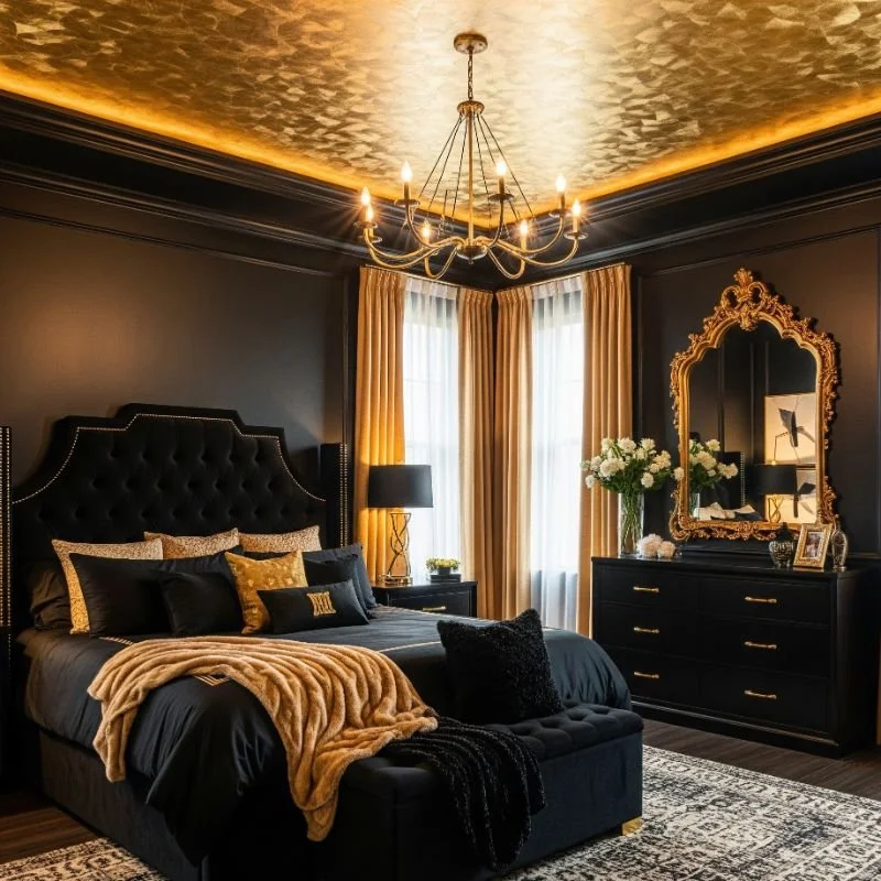 Transform your master bedroom into a luxurious retreat by combining deep black walls with sumptuous gold accents that create an atmosphere worthy of the world's most exclusive hotels. Start with rich black paint or dramatic wallpaper that serves as a sophisticated backdrop for gold-finished furniture, ornate picture frames, and shimmering textile details. Layer in gold through bedside lamps with metallic bases, picture frames that catch and reflect light, or even gold-leafed headboards that become stunning focal points. The key lies in balancing the drama of black with the warmth of gold through strategic lighting that prevents the space from feeling too dark or overwhelming. Consider adding mirrored surfaces, crystal chandeliers, or gold-trimmed mirrors that amplify light while enhancing the glamorous atmosphere. This combination creates bedrooms that feel both intimate and grand, perfect for unwinding after long days.