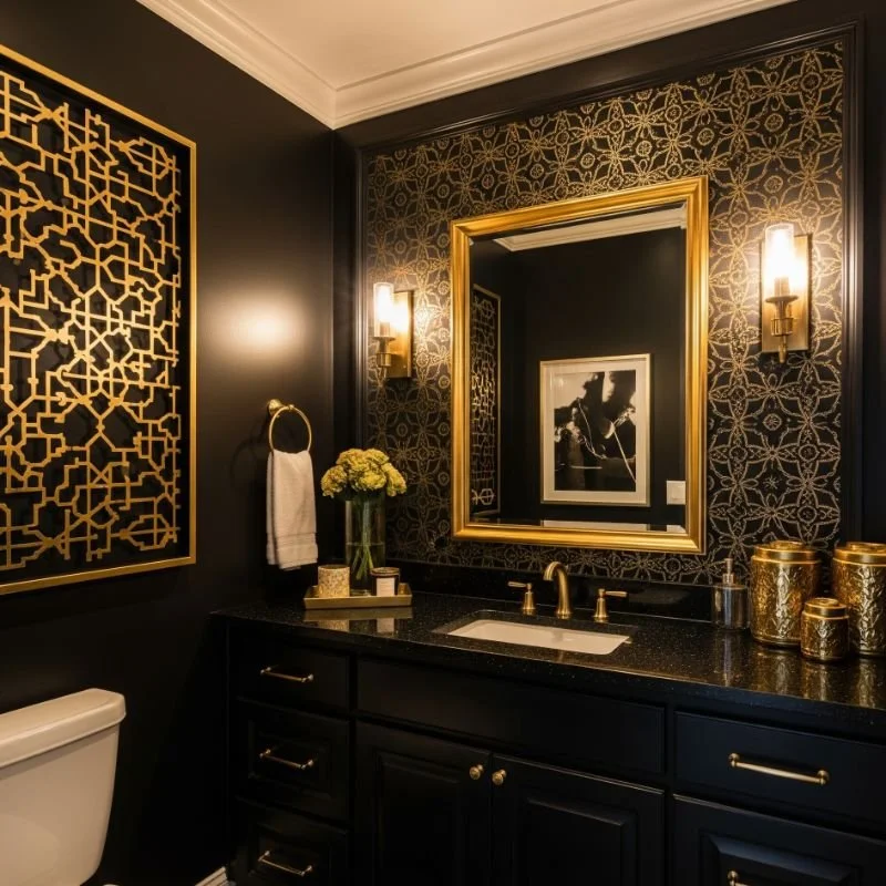 10. Chic Black and Gold Powder Room
