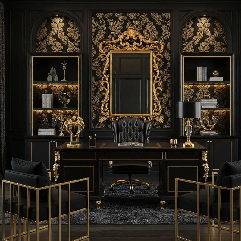 5. Opulent Home Office with Black and Gold Details
