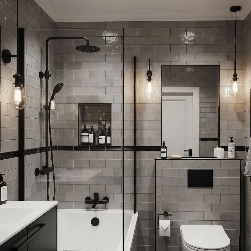 Classic subway tiles get a modern makeover when you pair soft grey ceramics with bold black grout lines. This combination creates striking geometric patterns that add visual interest without overwhelming your space. Install tiles in traditional brick patterns or experiment with herringbone layouts for contemporary flair. The dark grout lines act like artwork, creating grid patterns that guide the eye and make walls appear taller. Choose varying shades of grey tiles for subtle variation, or stick with uniform color for clean minimalism. This approach works beautifully in shower surrounds, backsplashes, or full wall applications, offering endless versatility while maintaining that sophisticated monochromatic palette throughout your bathroom design.