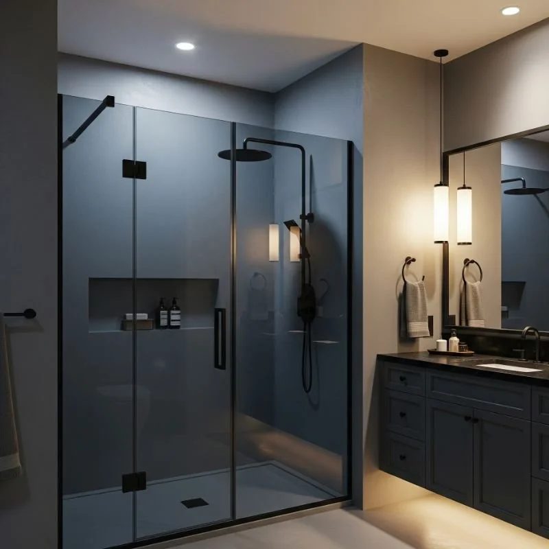 Modernize your shower space with sophisticated grey-tinted glass panels framed in sleek black metal for contemporary elegance that maximizes light while maintaining privacy. The subtle grey tinting reduces glare while creating cohesive color flow throughout your bathroom design. Black frames add structural definition that complements other dark accents like faucets, lighting, or hardware. This combination works particularly well in minimalist designs where clean lines and quality materials take center stage. Choose from various glass textures like frosted, rain, or clear options depending on your privacy preferences and aesthetic goals. The transparency maintains spatial openness while the frame color ties into your monochromatic palette, creating seamless integration that makes bathrooms feel larger and more luxurious.