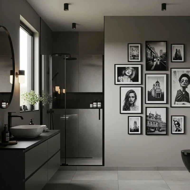 Transform your bathroom walls into curated gallery spaces featuring striking black and white photography that complements your monochromatic design scheme. Choose images that resonate with your aesthetic preferences, whether architectural details, nature scenes, or abstract compositions. Frame photographs in sleek black frames against grey walls for dramatic impact, or use white frames against dark walls for reverse contrast. Create cohesive collections by selecting images with similar themes, compositions, or emotional tones. This personal touch makes your bathroom feel like an extension of your living space rather than a purely functional room. Gallery walls work especially well in powder rooms or above bathtubs where you can enjoy the artwork during relaxing soaks.