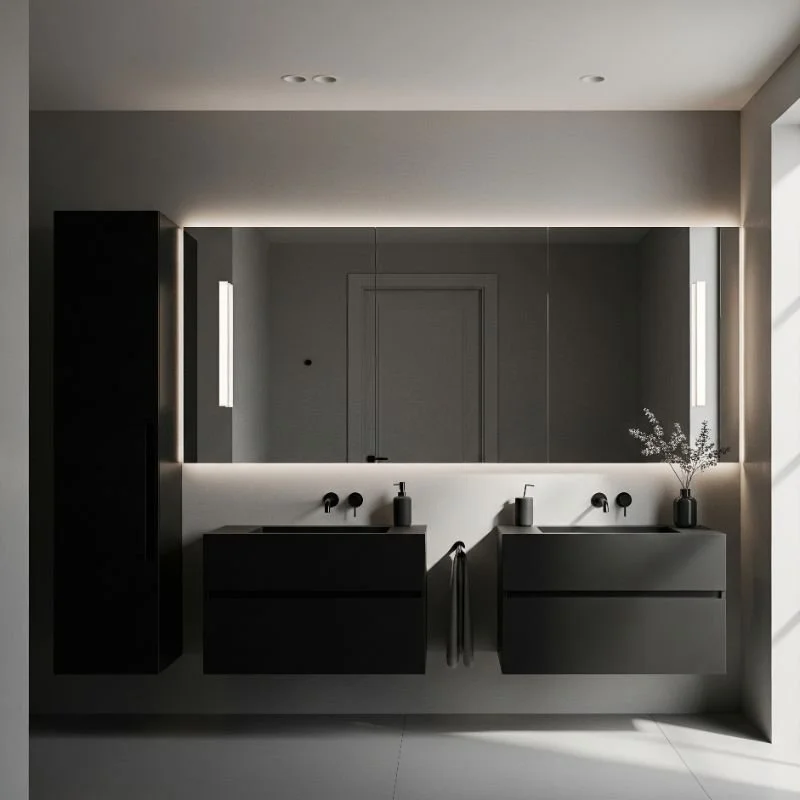4. Statement Black Vanities Against Grey Backdrops