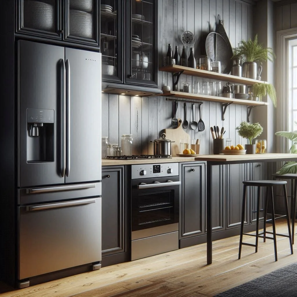 Integrated appliances can create a seamless and cohesive look in your kitchen. Hide your refrigerator, dishwasher, and other appliances behind black or grey panels that match your cabinetry. This design choice helps maintain a sleek and uncluttered appearance, allowing the kitchen's design to shine without interruption. By camouflaging appliances, you achieve a streamlined, modern aesthetic that emphasizes clean lines and uniformity. Additionally, this approach can make a smaller kitchen feel more spacious and organized. Opt for high-quality panels that blend perfectly with your existing cabinetry to ensure a flawless finish.