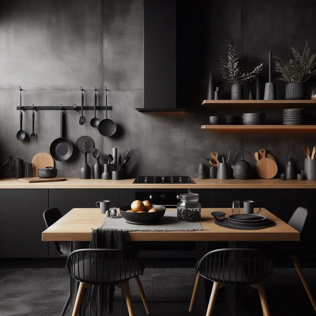 Opt for grey flooring to ground your kitchen's design. Whether you choose tiles, hardwood, or vinyl, grey flooring provides a neutral base that balances the boldness of black elements. It also adds warmth and texture to the space, making it more inviting. The versatility of grey allows it to complement a variety of styles, from modern to rustic. Additionally, grey flooring is practical, hiding dirt and wear better than lighter shades. By incorporating grey flooring, you create a cohesive and harmonious look that enhances the overall aesthetic and functionality of your kitchen.