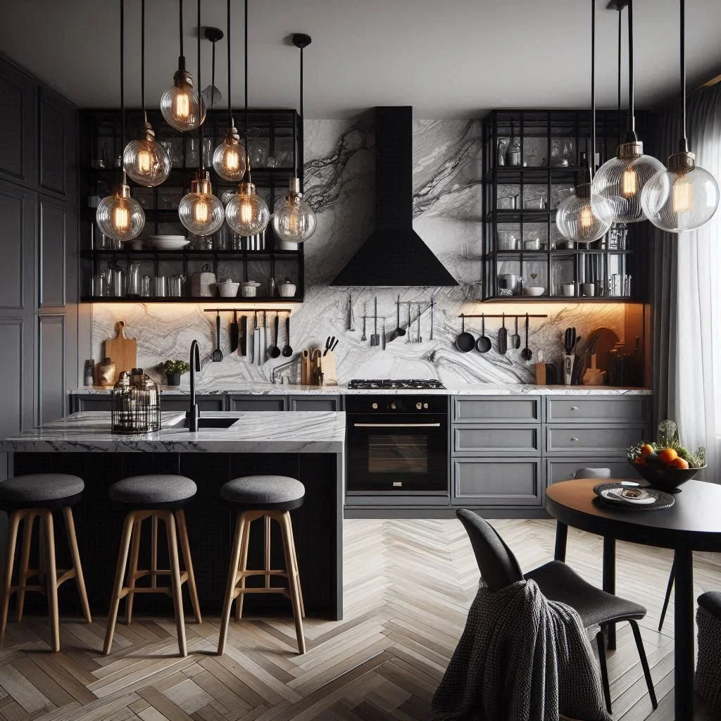 Add statement lighting to your kitchen to create a focal point and enhance the ambiance. Pendant lights, chandeliers, or under-cabinet lighting in black or grey can add a touch of elegance and sophistication. Opt for sleek, modern fixtures that complement the overall design and provide adequate illumination. Pendant lights above an island or dining area can create a striking visual effect, while under-cabinet lighting ensures functional task lighting for food preparation. Choose fixtures with clean lines and contemporary finishes to seamlessly integrate them into your kitchen's aesthetic. By thoughtfully selecting and placing lighting, you can enhance both the style and functionality of your kitchen, making it a more inviting and efficient space.