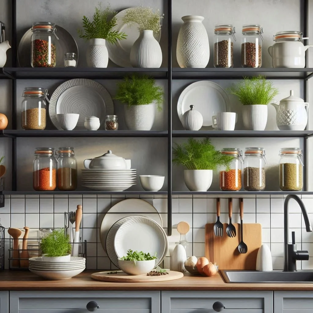Open shelving in black or grey can add a modern touch to your kitchen while providing practical storage solutions. These shelves offer a sleek and contemporary look that complements a variety of kitchen styles. Display your favorite dishware, cookbooks, or decorative items on open shelves to personalize your space and keep it organized. The open design makes it easy to access everyday items while also creating an opportunity to showcase your unique style. Whether you opt for industrial metal shelves or minimalist wooden ones painted in black or grey, this storage solution enhances both the functionality and aesthetic appeal of your kitchen.