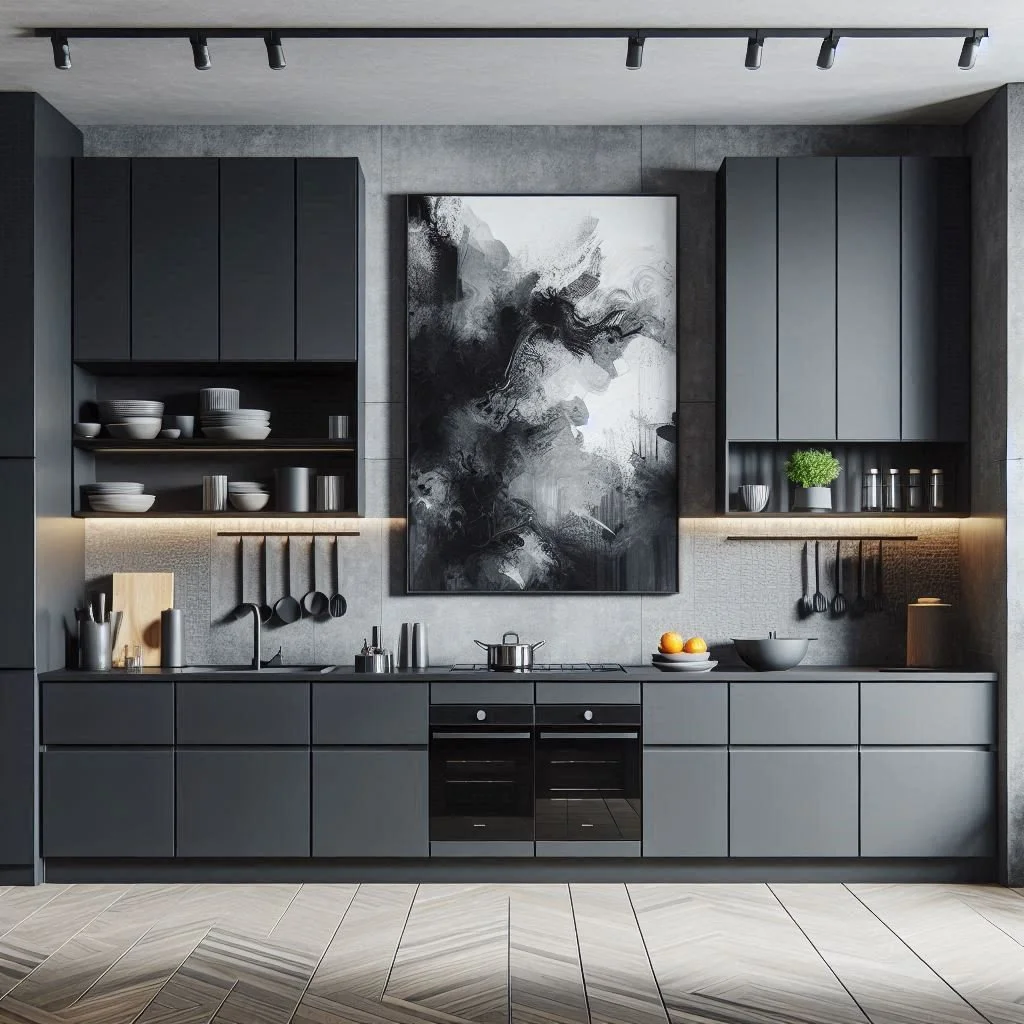 Finally, add personal touches to make your kitchen uniquely yours. Display family photos, artwork, or cherished mementos in black or grey frames. These personal elements infuse your kitchen with warmth and character, ensuring it feels inviting while maintaining its sleek, modern aesthetic. Consider adding a blackboard for family notes, a collection of favorite cookbooks, or a display of unique souvenirs from travels. These thoughtful additions not only enhance the visual appeal of your kitchen but also create a space that reflects your personality and style, making it truly feel like the heart of your home.