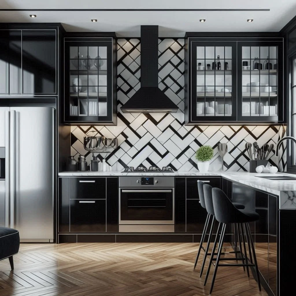 Geometric patterns, subway tiles, and herringbone designs in black and white are excellent choices. These styles add visual interest and complement the sleek aesthetic.