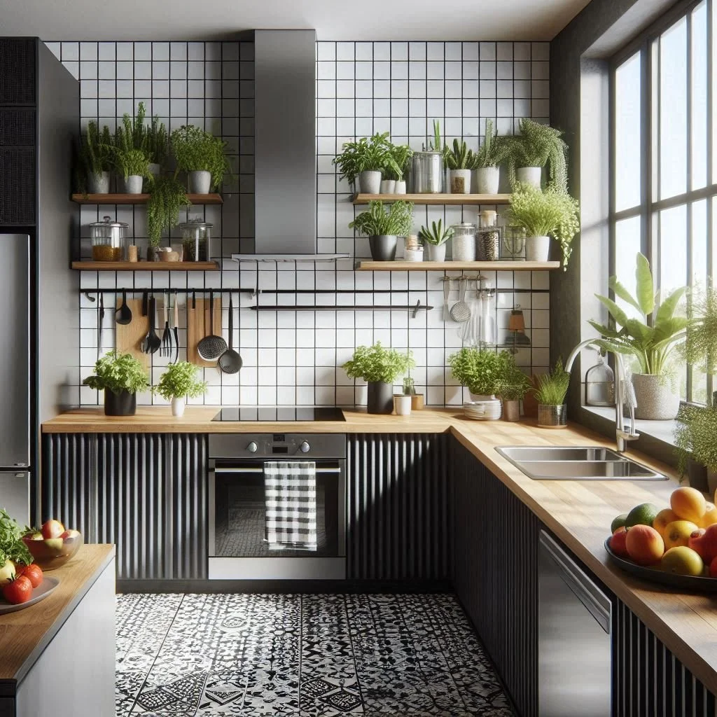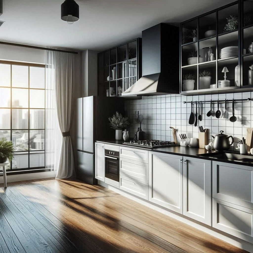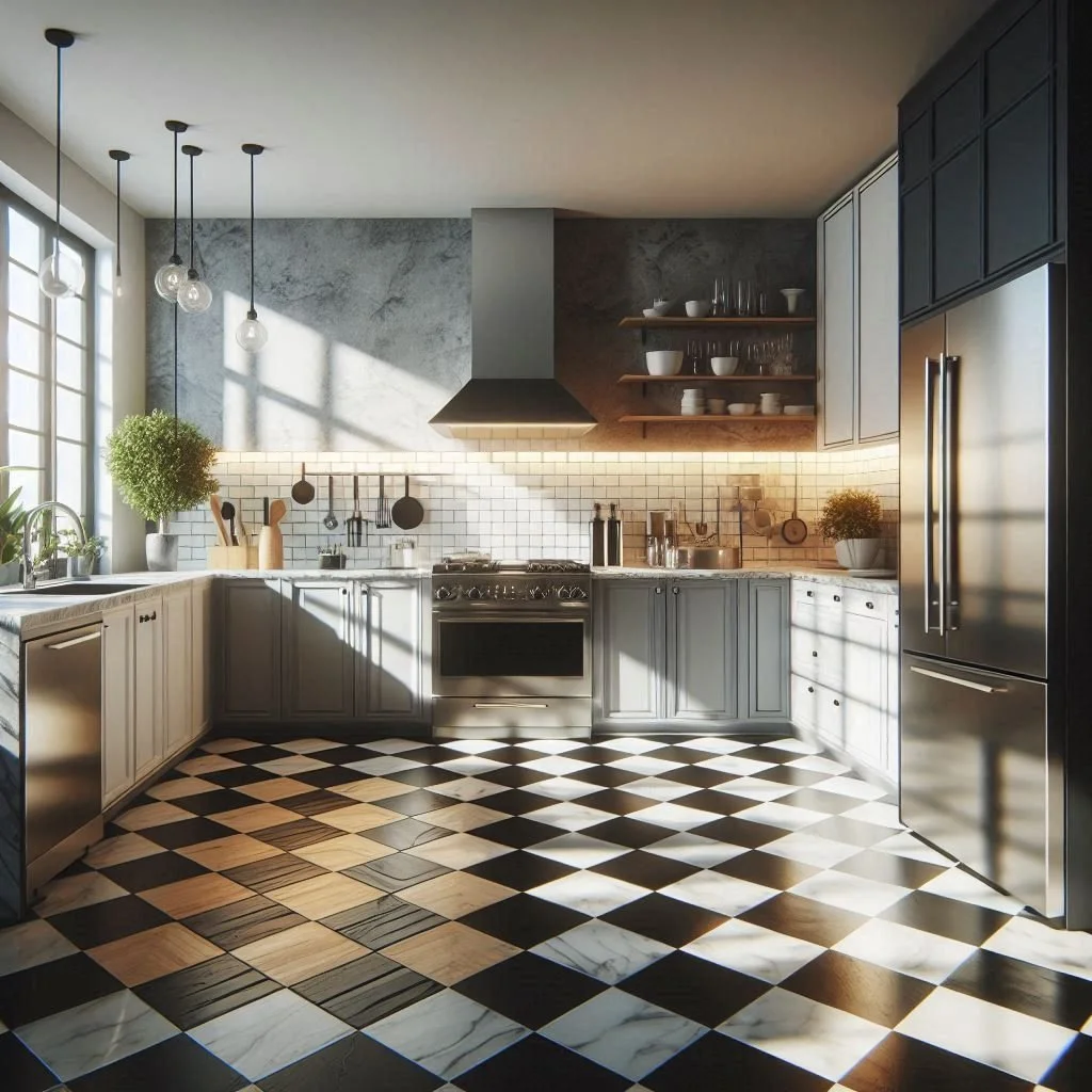 Flooring is an essential element in any kitchen design, significantly impacting the room's overall aesthetic. Black and white tiles arranged in a checkerboard pattern offer a timeless, classic look that adds a touch of vintage charm. Alternatively, opting for modern geometric designs can introduce a contemporary twist, infusing the space with a fresh and stylish vibe. Both options make a bold statement and serve as a striking focal point, enhancing the kitchen's visual interest. By choosing a distinctive black and white flooring design, you create a strong foundation that complements various decor styles and adds a dynamic element to your kitchen, ensuring it stands out with elegance and character.