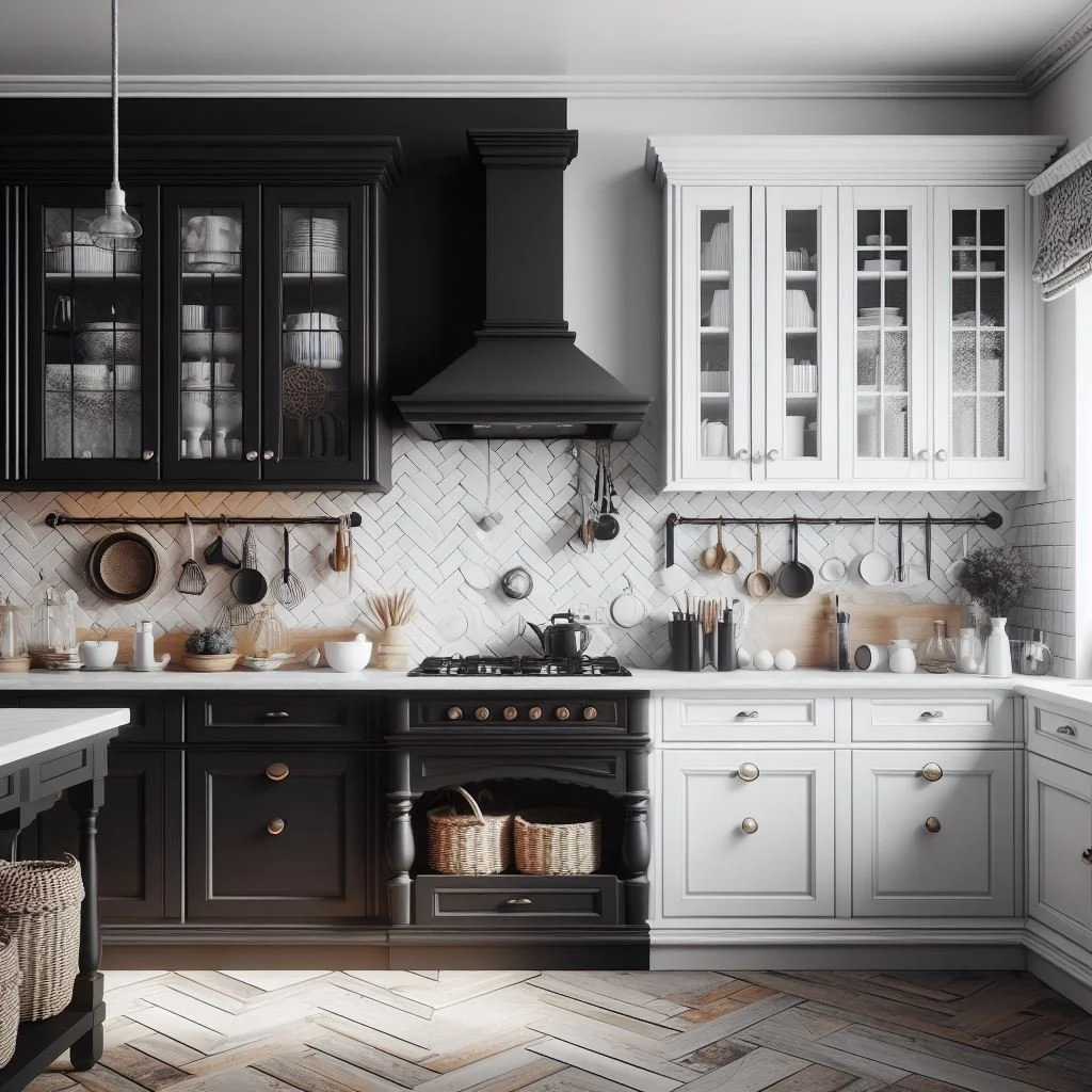 Two-tone cabinets can bring depth and interest to your kitchen, offering a dynamic and stylish look. Combining black and white cabinets creates a modern aesthetic that is visually engaging. For a balanced design, consider using black cabinets on the bottom and white on the top, or vice versa. This arrangement not only adds contrast but also enhances the sense of space and light in the kitchen. The interplay of dark and light tones can highlight architectural features and provide a sophisticated backdrop for other design elements. With two-tone cabinets, you achieve a harmonious blend of elegance and contemporary flair, making your kitchen both functional and beautiful.