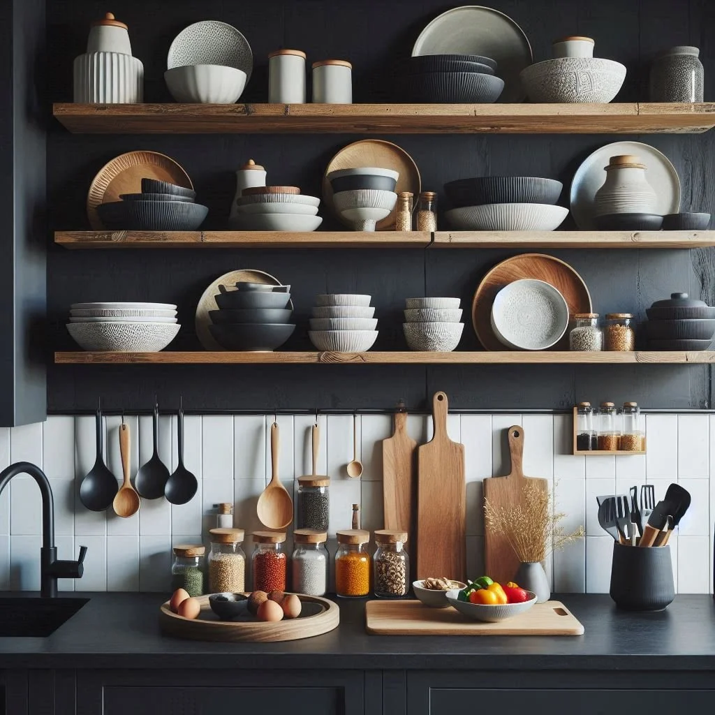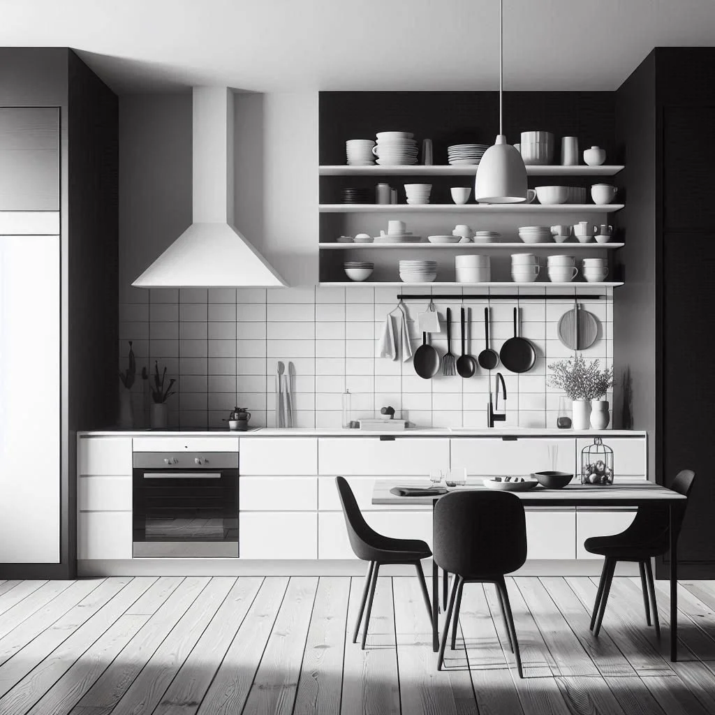 Open shelving can impart a modern, airy feel to your kitchen while beautifully showcasing your black and white decor. Utilizing black or white shelves to display dishes, glassware, and decorative items creates a visually appealing and organized space. This design choice not only enhances the feeling of openness but also allows you to personalize your kitchen with carefully curated displays. The contrast between the shelves and their contents adds depth and interest, making the kitchen feel both stylish and functional. By incorporating open shelving, you achieve a balance between practicality and aesthetics, making your kitchen look more spacious and inviting.