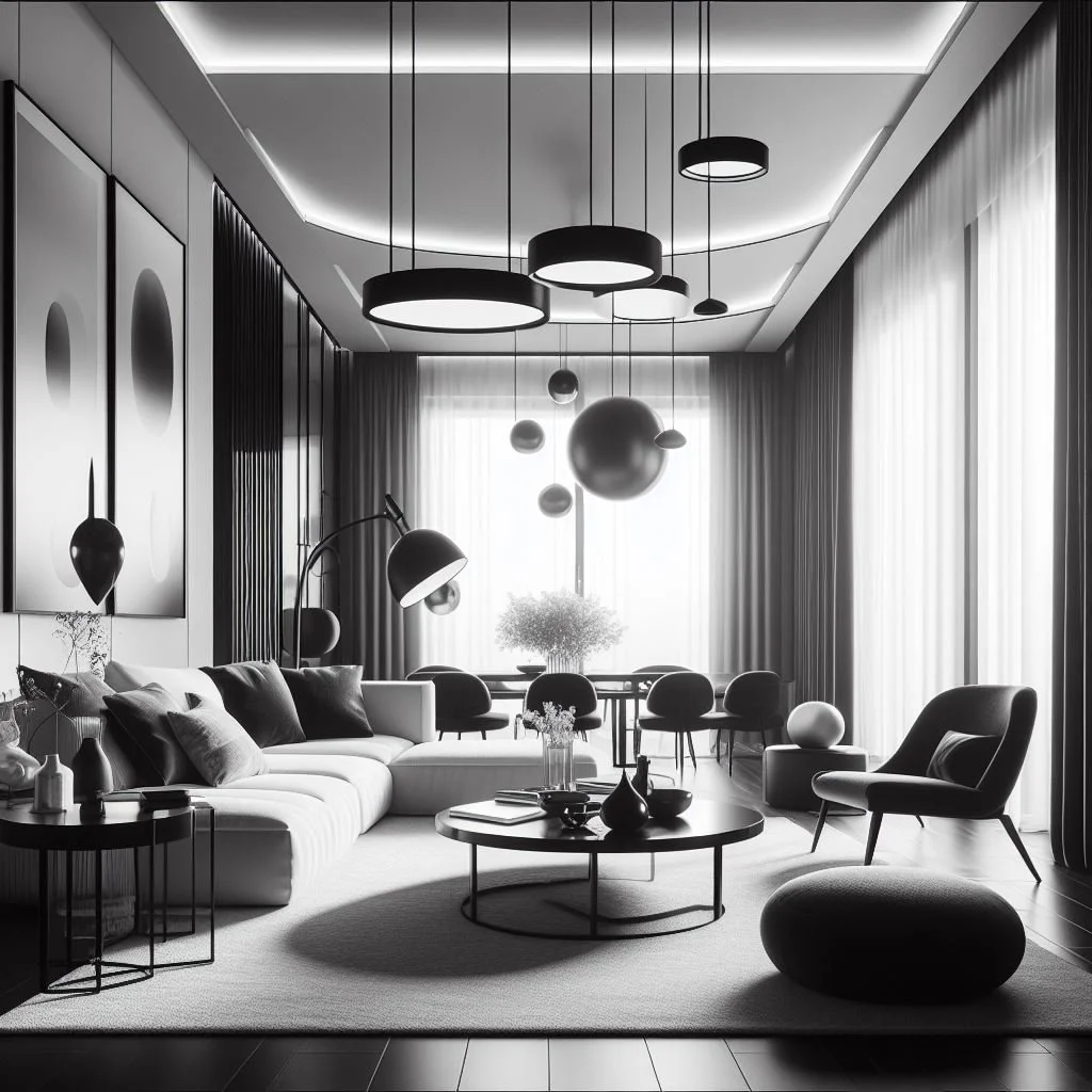 Illuminate your living room with sleek and modern lighting fixtures in black or white finishes. Opt for minimalist designs such as pendant lights, track lighting, or floor lamps that seamlessly blend with the overarching aesthetic of your space. These refined fixtures not only provide ample illumination but also serve as stylish focal points, elevating the ambiance of your living area with their understated sophistication. Whether suspended from the ceiling or elegantly poised on the floor, these lighting elements contribute to the overall modernist vibe of your room, casting a luminous glow that accentuates its clean lines and sleek finishes.
