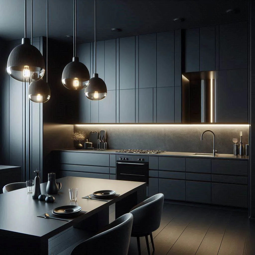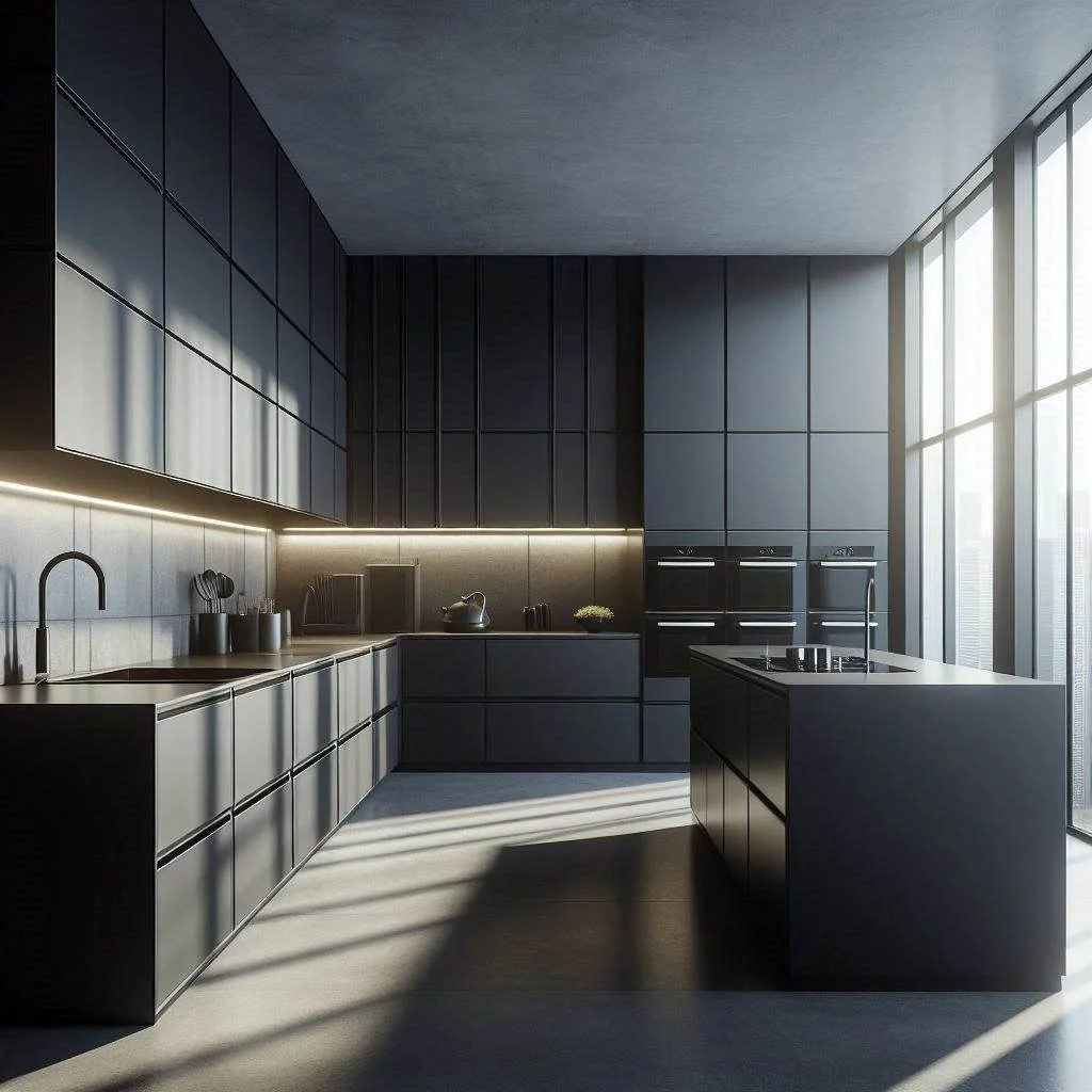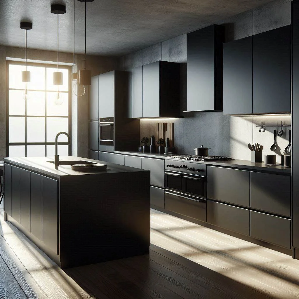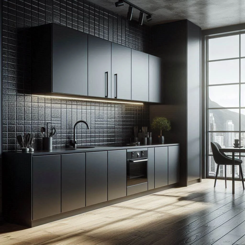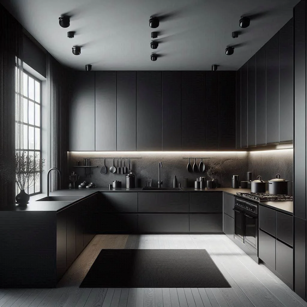 Keep your black kitchen design simple and sleek with minimalist elements that focus on clean lines and functionality. Opt for handleless cabinets to create a smooth, streamlined look that enhances the modern, clutter-free aesthetic. Sleek appliances in stainless steel or matte finishes complement the minimalist approach, maintaining the boldness of the black theme while allowing the space to feel open and organized. The key is to focus on simplicity and efficiency, eliminating unnecessary details while maximizing the kitchen's utility. This approach not only creates a visually striking space but also emphasizes practicality, making it easy to maintain and use. With its modern, clean design, a minimalist black kitchen offers a perfect balance of style and function, creating a bold yet inviting environment.